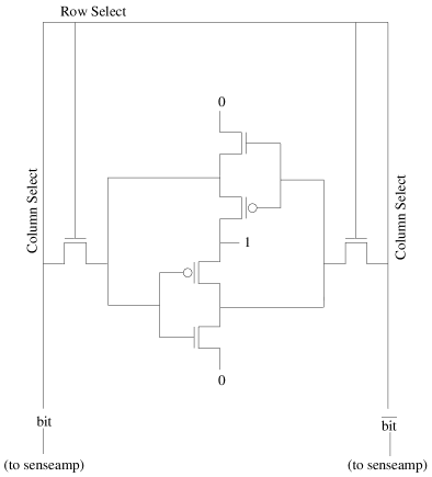 The two inverters (i.e., the four middle transistors) provide storage for a single bit. Think of the bit as continously going around and around the two inverters in a counter-clockwise manner. The bit is the output of the top inverter, and the complement of the bit is the output of the bottom inverter as well as the input to the top inverter. The following occurs when we want to read the bit stored in this SRAM cell: