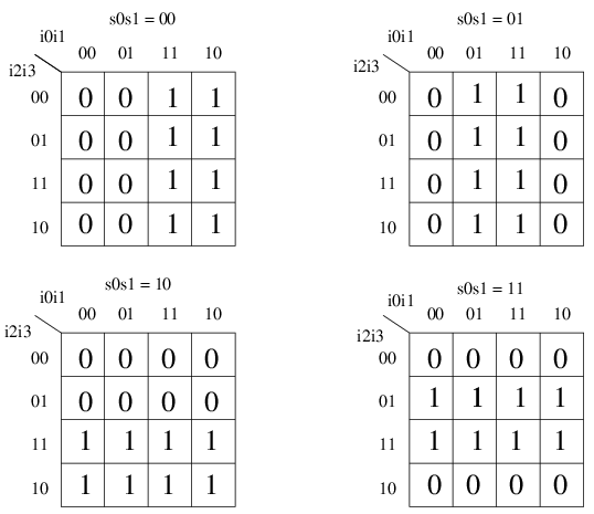 s0 s1 i0 i1 i2 i3 output | s0 s1 i0 i1 i2 i3 output 0 0 0 0 0 0 0 | 1 0 0 0 0 0 0 0 0 0 0 0 1 0 | 1 0 0 0 0 1 0 0 0 0 0 1 0 0 | 1 0 0 0 1 0 1 0 0 0 0 1 1 0 | 1 0 0 0 1 1 1 0 0 0 1 0 0 0 | 1 0 0 1 0 0 0 0 0 0 1 0 1 0 | 1 0 0 1 0 1 0 0 0 0 1 1 0 0 | 1 0 0 1 1 0 1 0 0 0 1 1 1 0 | 1 0 0 1 1 1 1 0 0 1 0 0 0 1 | 1 0 1 0 0 0 0 0 0 1 0 0 1 1 | 1 0 1 0 0 1 0 0 0 1 0 1 0 1 | 1 0 1 0 1 0 1 0 0 1 0 1 1 1 | 1 0 1 0 1 1 1 0 0 1 1 0 0 1 | 1 0 1 1 0 0 0 0 0 1 1 0 1 1 | 1 0 1 1 0 1 0 0 0 1 1 1 0 1 | 1 0 1 1 1 0 1 0 0 1 1 1 1 1 | 1 0 1 1 1 1 1 0 1 0 0 0 0 0 | 1 1 0 0 0 0 0 0 1 0 0 0 1 0 | 1 1 0 0 0 1 1 0 1 0 0 1 0 0 | 1 1 0 0 1 0 0 0 1 0 0 1 1 0 | 1 1 0 0 1 1 1 0 1 0 1 0 0 1 | 1 1 0 1 0 0 0 0 1 0 1 0 1 1 | 1 1 0 1 0 1 1 0 1 0 1 1 0 1 | 1 1 0 1 1 0 0 0 1 0 1 1 1 1 | 1 1 0 1 1 1 1 0 1 1 0 0 0 0 | 1 1 1 0 0 0 0 0 1 1 0 0 1 0 | 1 1 1 0 0 1 1 0 1 1 0 1 0 0 | 1 1 1 0 1 0 0 0 1 1 0 1 1 0 | 1 1 1 0 1 1 1 0 1 1 1 0 0 1 | 1 1 1 1 0 0 0 0 1 1 1 0 1 1 | 1 1 1 1 0 1 1 0 1 1 1 1 0 1 | 1 1 1 1 1 0 0 0 1 1 1 1 1 1 | 1 1 1 1 1 1 1That is truly a horrible truth table, but sometimes we have to solve truth tables like that, so let's see what a 6-variable K-map would look like: