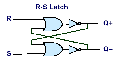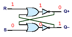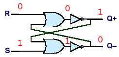 When both R and S are set to 1, the output of the circuit is a single stored bit that can be thought of as constantly looping through the circuit.