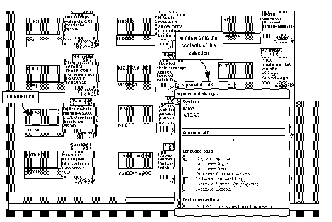 In Figure 1, the view onto the information space is partially obscured by a separate scrollable window that shows the selected System's internal structure, its slots. In this case, the slots "Name," "Commercial?," "Language-pairs," and "Performance Data" and their values are visible in the smaller window.