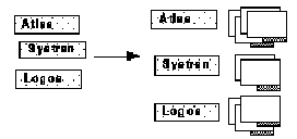 Figure 1 shows a limited view of a much larger Aquanet information space. A user can zoom or scroll this view to see more of the space, which can extend in all directions. Objects shown in the primary view are drawn according to a user-specified graphic appearance that is associated with each type of basic object and relation. For example, the selection - an instance of a System object - is portrayed on the computer screen as purple rectangle that displays the object's name, which in this case is "Atlas." As is apparent in the figure, objects may overlap; users can manipulate the stacking order to see obscured objects.