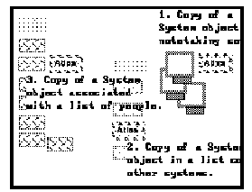 In our application, informal relations were defined by providing the appropriate spatial setting for basic objects; in effect, Aquanet's virtual copy mechanism was used to reference the same objects from different spatial contexts. In the simplified diagrammatic example shown in Figure 3, the same (highlighted) System basic object, Atlas, is used in three informal relations. In the area marked (1), the System basic object is being used in a notetaking setting; it is next to the pile of source Articles that provide the information integrated and reformulated in the System's slots. In the area marked (2), a reference to the same Atlas object is seen in a setting of other System objects; in this setting Systems can be collected, compared, and ordered, possibly by their apparent maturity or level of use. In the area marked (3), the System object Atlas is associated with a list of individual researchers, developers, and sponsors responsible for producing the system. If formal relations were to be defined, (1) might be expressed as a one-to-many "based-on" relation; (2) might be a "set" relation (as described in [14]); and (3) might be a complex "influenced" relation between researchers, developers, sponsors and a System.