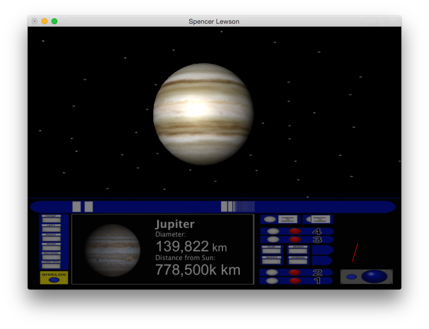 of the screen, including the planet's true image, name, size, and distance from the sun. Also displayed on the control panel is